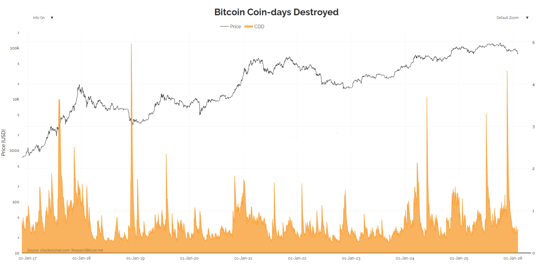 Large spikes in CDD usually mean that very old coins are moving, which typically reflects long-term holders taking action. Historically, these spikes tend to occur: